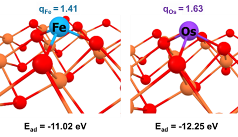 DFT计算结果表明,Fe(3d)和Os(5d) 原子能够稳定吸附在MgO(111)表面,证明MgO(111)作为负载单原子的基底材料具有巨大的潜力。