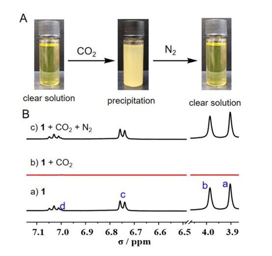 接下来,作者深入探索了CO2的脱附/释放条件。室温下将纯N2以10 mL /min的流速通入浑浊溶液中,溶液变得澄清,浊度在15分钟内恢复到最小值(~0 NTU)(图4D)。而没有使用N2流处理的浑浊溶液的浊度保持完全不变。该结果表明超蕃1可以通过简单的N2流处理在室温下再生。与传统化学吸附剂捕获和释放CO2类似,吸附剂有效再生和释放CO2所需的气体流 (N2或Ar)阻碍了释放CO2的实际浓度和回收,所以仍需探索新的CO2脱附方法。
