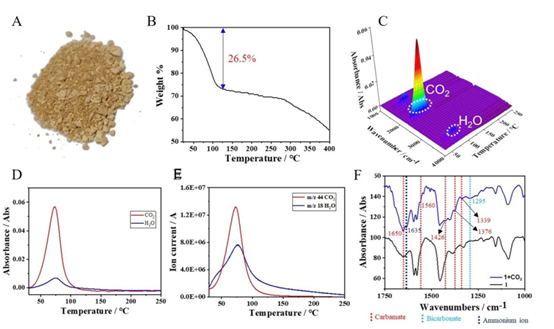 图3 (A)超蕃1和CO2复合物粉末。(B) 复合物粉末的TGA图。(C) 复合物粉末经过热处理后的TGA分析所得气体的三维FTIR光谱。(D) TGA–FTIR测量过程中CO2和H2O的释放速率。(E) 复合物粉末的TGA–MS显示CO2和H2O的摩尔比为1:1。(F) 超蕃1与复合物粉末的FTIR光谱。