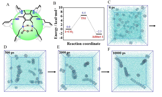图6 (A)提出的粒子表面“附着”胺单元的超蕃1伪粒子模型(绿色突出),以及超蕃1和CO2在伪粒子表面的优化六元环过渡态(TS1,红色突出)。(B)超蕃1捕获CO2形成氨基甲酸酯(加合物1)的能量分布图。(C) t = 0 ps时刻的分子动力学模拟轨迹帧快照;(D) t = 500 ps;(E) t = 2000 ps;(F) t = 10000ps