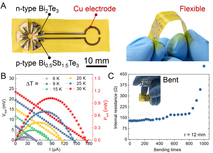 图2. 柔性热电装置和发电效率。(A) 圆形多脚热电装置由6对n型Bi2Te3和p型Bi0.5Sb1.5Te3矩形薄层组成(左图)。柔性聚酰亚胺层密封了整个装置,防止其接触皮肤,以实现生物兼容性。黑色和红色箭头分别表示热电材料和铜电极。该装置可以折叠(右图)。(B)生物兼容柔性热电装置的输出电压和功率与温差的关系。(C) 在弯曲半径为12毫米时,该装置的内阻与弯曲次数的关系显示,该装置在弯曲400次后的衰减可忽略不计。插图显示该装置可绕直径为 12 毫米的玻璃底部弯曲。