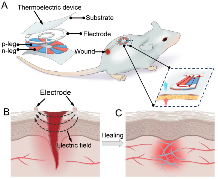 图1. 使用柔性生物兼容热电装置加速皮肤伤口愈合的示意图。(A) 左图为薄膜结构柔性热电(TE)装置的剖视图。(B)显示TE设备产生的电流刺激成纤维细胞向伤口方向移动。(C) 显示柔性热电装置可快速愈合伤口。