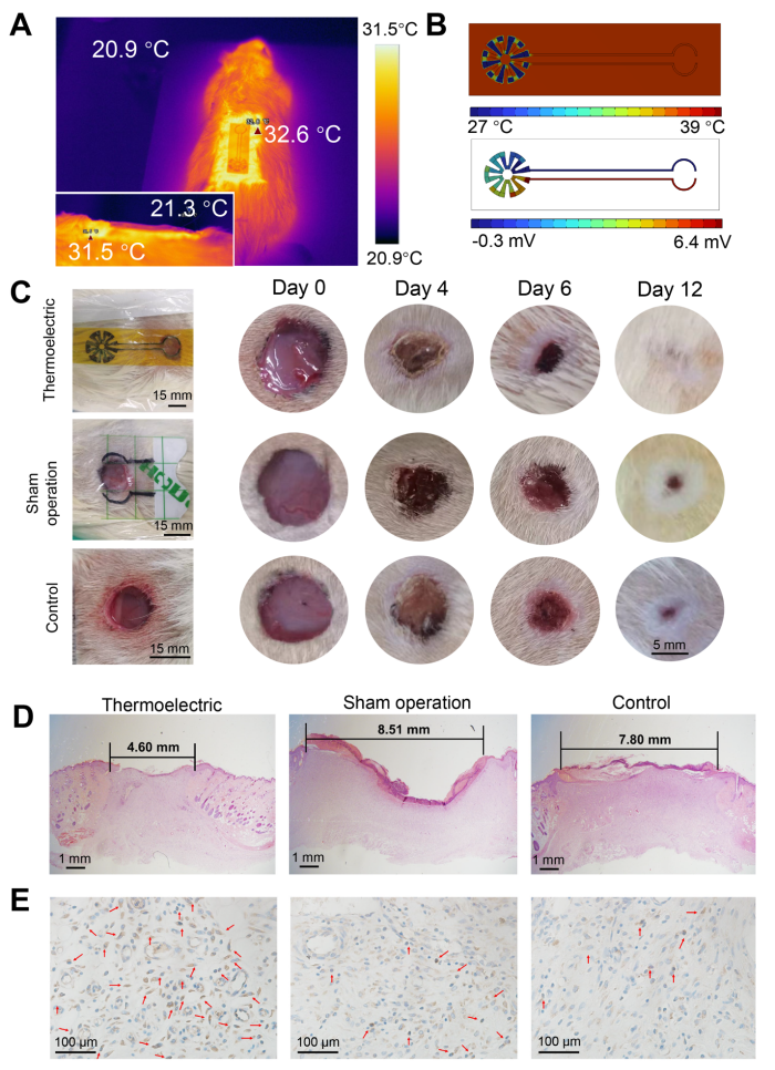 图3. 热电装置在体内的伤口愈合效果。(A) 红外热图像的俯视图,显示了麻醉大鼠在 30 分钟内贴上柔性热电装置后的温度分布。插图为温度分布的侧视图。(B) 有限元分析解析了柔性热电装置内的温度分布(上图)和相应的电场(下图)。(C) 热电装置、假手术组和空白组的体内实验配置,以及12天内整个伤口愈合过程的代表性图像。装有热电装置的伤口比其他组快4天愈合。(D) 各组治疗6天的大鼠组织切片的H&E图像,显示与假手术组和对照组相比,热电装置能迅速闭合伤口并将炎症降至最低。(E)免疫组化图像取自(D)中的切片区域。红色箭头标示免疫组化染色阳性细胞,表明热电装置组中抗 Piezo1 阳性细胞更多。
