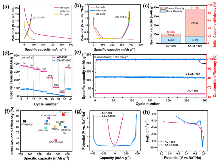 直接炭化的活性炭(AC-1300)在30 mA g−1的电流密度下,可逆容量仅有76.7mAh g−1,首效仅有13.3%。相比之下,在该策略下制备的最佳复合材料(XA-4T-1300)具有383.0 mAh g−1,ICE为91.1%。在1A g−1条件下,XA-4T-1300经过300次循环后的容量保留率高达95.5%。该研究为高性能钠离子负极材料的设计提供了新思路。