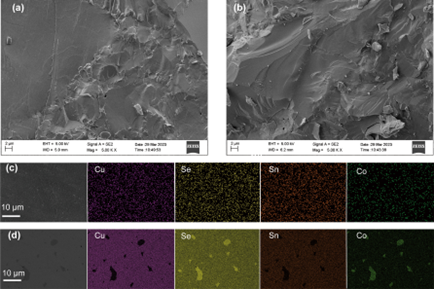 图2. (a) x = 0和(b) x = 0.12断口的SEM图像以及x = 0.09 (c)和0.12 (d)组成元素(Cu, Se, Sn, Co)的EDS图谱。