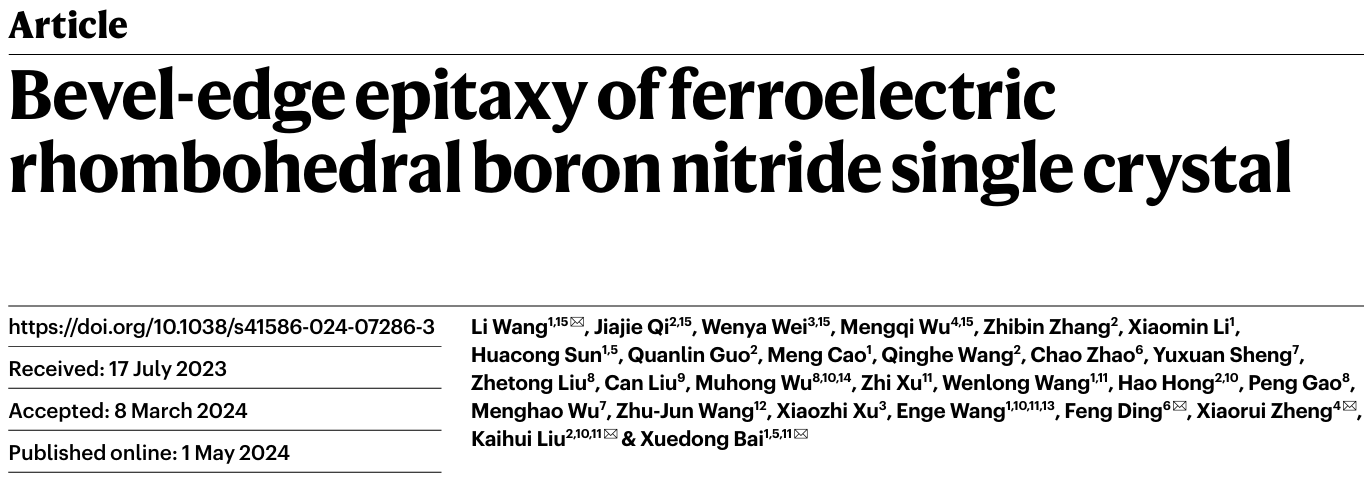 本文已经报道了一种简单的方法,通过斜面边缘外延的二维层,在每个接口有效地控制每一层的晶格取向和滑动矢量。在由平台Ni(100)和斜面Ni(110)组成的平行台阶聚束形貌的衬底上,生长了4 × 4cm ~ 2的rBN单晶薄膜,厚度在2.2 ~ 12 nm范围内。然后,在生长的rBN层中证明了具有高居里温度的鲁棒,均匀和可切换的铁电性,这对于实现基于多功能2D介电材料的先进器件具有很大的希望。该成果提出了倾斜台阶面制备多层菱方氮化硼单晶的新方法,创新表面外延生长模式,通过精准排列三维空间原子,人工制造新型晶体,赋予铁电存储功能,为制造存算一体器件提供新材料策略,助力人工智能时代芯片技术的变革性发展。