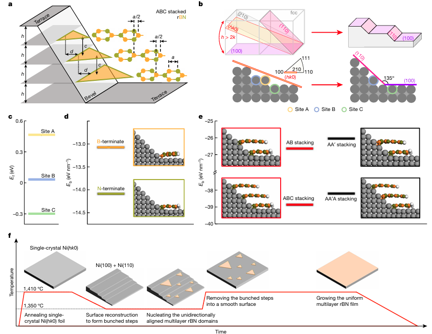 图1斜面台阶外延生长多层菱方氮化硼单晶的原理和制备流程。© 2024 Nature