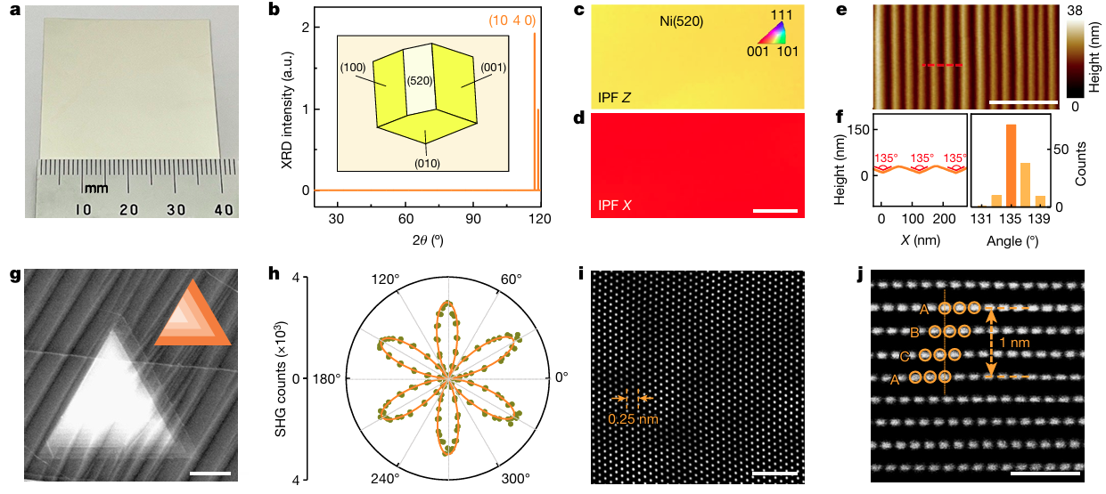 用籽晶生长法实验制备了典型尺寸为4 × 4 cm2的单晶Ni(520)箔衬底(图2a)。X射线衍射(XRD)2θ扫描图案(图2b)、重建的单晶XRD数据(图2b的插图)和电子背散射衍射(EBSD)图(图2c、d)揭示了所制备的衬底的单一结晶度。在表面重建阶段之后,可以通过原子力显微镜(AFM)测量观察到由平台Ni(100)和斜面Ni(110)组成的聚束台阶的形态,因为基于大面积上的统计数据,两个刻面之间的角度似乎约为135°(图2 e,f)。然后,发现在成核阶段中通过这种聚束步骤引导每层中具有一致取向的多层三角形域(图2g),并且通过具有六重对称性和相干增强强度的偏振相关二次谐波产生(SHG)图案验证了该域的无扭曲堆叠(图2 h)。我们进一步进行了平面和横截面高角度环形暗场(HAADF)扫描透射电子显微镜(STEM)的原子分辨测量,以明确显示rBN相的ABC堆叠(图2 i,j)。