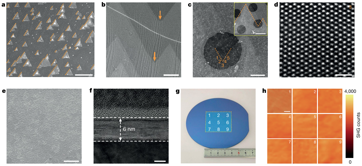 图3 取向一致的菱方氮化硼晶畴逐层无缝拼接形成均匀单晶薄膜。© 2024 Nature