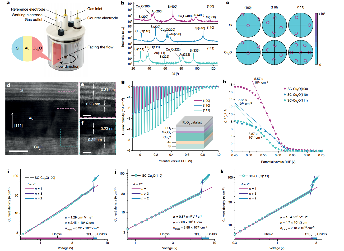 作者利用溶液电化学外延生长技术,提出了一种新的方法来制备三种不同晶向的高质量单晶Cu2O薄膜。并结合超快瞬态反射光谱量化分析了Cu2O各向异性光电特性,成功制备了以[111]为主要晶向的多晶Cu2O光电极,超越了目前最先进的Cu2O 光电催化性能,实现了在光电催化制氢的效率突破。