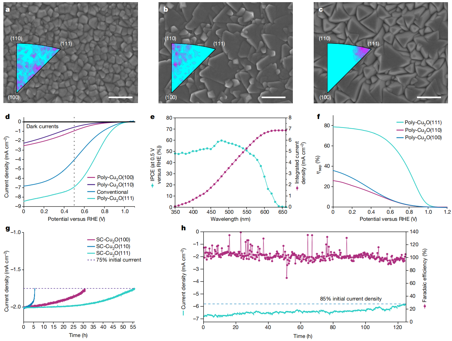 南开大学罗景山教授团队与英国剑桥大学Samuel D. Stranks教授团队以及瑞士洛桑联邦理工学院Michael Grätzel教授和Anders Hagfeldt教授团队合作,采用溶液电化学Cu2O薄膜外延生长技术成功制备出高质量的[111]、[110]和[100]晶向的单晶Cu2O光电极,并揭示了不同晶向对Cu2O体相内载流子复合的影响机制。作者发现单晶Cu2O沿[111]晶向具有更优的载流子迁移率、电导率和载流子扩散长度,并展现出相对更大的光电流密度。结果显示,在0.5V时沿[111]晶向和(111)晶面的Cu2O光电极的光电流密度达到7 mA cm-2,提高了70%。此外,作者还探究了不同晶向对Cu2O光电极稳定性的影响,他们发现Cu2O光电极沿[111]晶向和(111)晶面在空气质量 1.5 G 的照明下使用可逆氢电极可以稳定运行120 小时以上。