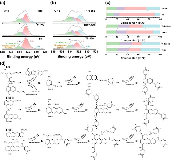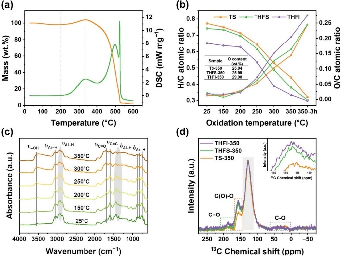 将沥青组分分别进行预氧化处理。利用元素分析、原位红外模拟氧化交联反应历程,结合X射线光电子能谱、固体核磁和热重质谱探究交联产物的化学组成、结构及失重行为,从而揭示沥青组分在预氧化过程中的反应历程及机制。研究发现,由于极性官能团的富集,THFI呈现出最高的氧化反应活性,其氧化产物中的C=O和O=C–O含量更高,建立了更为充分的三维交联结构,有利于后续硬炭结构的形成和发展。