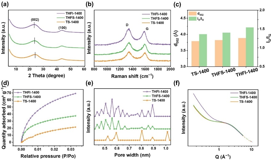 将氧化沥青组分进一步高温炭化。利用扫描电镜、透射电镜、X射线衍射谱、拉曼光谱以及孔结构表征等探究交联结构对硬炭微观形貌、晶体结构以及孔隙结构等的影响规律,进一步阐明沥青组分间结构差异对其衍生硬炭微观形貌和结构的影响机制。研究发现,THFI建立的三维交联结构有效地限制了炭化过程中碳层的重排,扩大了层间距,促进了超微孔的发展和无序结构的形成。因此,THFI衍生硬炭(THFI-1400)呈现出较大的层间距、更为无序的微晶结构以及发达且连通性好的超微孔结构,有利于储钠性能的进一步提升。
