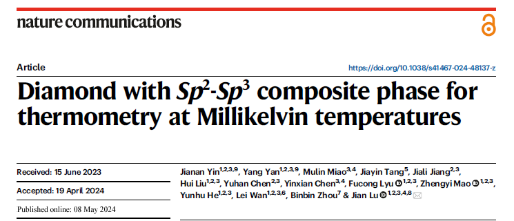 相关研究成果以题为“Diamond with Sp2-Sp3 Composite Phase for Thermometry at Millikelvin Temperatures.”发表在顶尖期刊《Nature Communications》上,通讯作者为吕坚院士(香港城市大学)。殷建安博士和颜阳博士生为论文共同第一作者。