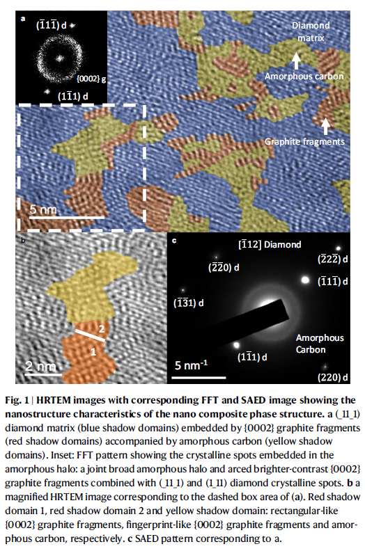 CPD是金刚石石墨化的结果。金刚石的石墨化通常被认为是不可取的,传统的石墨化金刚石具有明显的分界,表面的sp2碳层虽然能增强金刚石的导电性,但是分层结构会损害金刚石的机械性能和热稳定性。CPD具有与传统的石墨化金刚石不同的结构。TEM(图1a)显示,金刚石基体(蓝色阴影)中均匀的镶嵌着纳米非晶碳(黄色阴影)和石墨碎片(红色阴影)共同组成的sp2-杂化碳相。图1b表明了可能存在的相变过程:碳原子从金刚石的(1(_)11(_))平面直接转变为石墨{0002}平面(图1b中红色阴影1和2);以及金刚石的(1(_)11(_))平面先转变至过渡态的非晶碳相(图1b,黄色阴影)后继续转变成稳态的石墨碎片(图1b红色阴影)。图1c的选定区域电子衍射(SAED)图像显示出CPD所同时具有非晶碳环和金刚石晶格点阵。