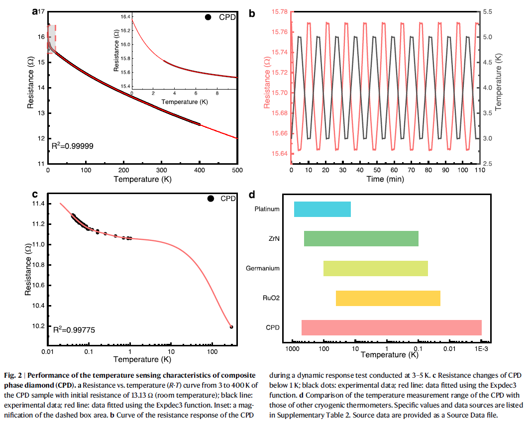在该工作中,研究团队通过一种简捷的方法,通过在大气条件下对金刚石进行热处理制备得到CPD。CPD具有负温度系数特性,其温度-电阻(R-T)曲线在整个测温范围内有极高的拟合度。实验结果表明,CPD是一种测温极限低至1mK、测量精度高达1mK的双mK级温度传感材料。同时,CPD对磁场的敏感度非常低并呈现出线性磁阻的特点,有利于其在复杂环境下使用。此外,CPD的热稳定性也有显著提升:相比于普通合成金刚石,CPD的起始氧化温度提高了超过200K。不仅如此,相比于昂贵的贵金属氧化物,合成金刚石的成本要低几十至上百倍。上述特性都使得CPD成为下一代低温温度传感器的重要候选材料之一。而这一进展对低温物理研究也具有重要意义,有利于促进量子系统、超导等诸多低温技术从研究向应用的落地。