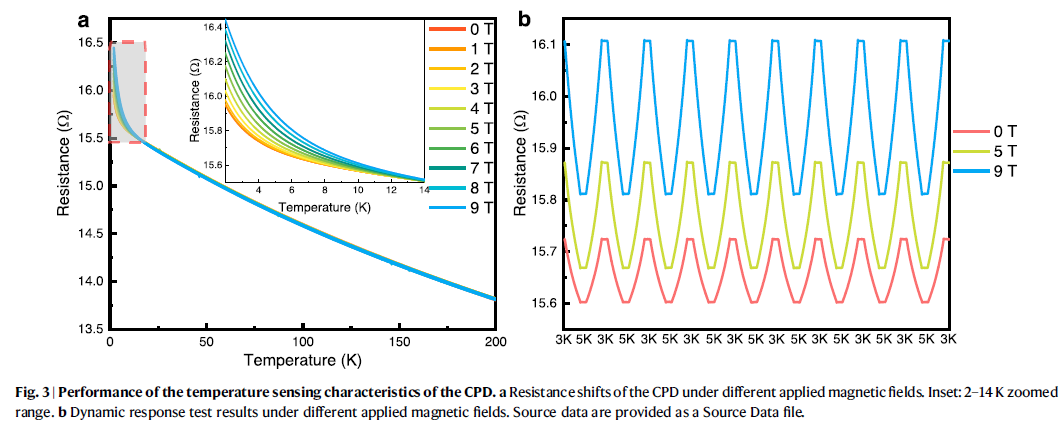 低温测温过程往往伴随着磁场的影响,比如核磁共振(NMR)等应用场景。磁场的存在会使得传感器的电阻值发生偏移,进而导致温度读数不准确。很多NTC温度传感器在磁场的影响下不仅电阻值偏移大,且偏移不规律,为校准和标定增加了很大的难度。图3a和图3b展示了CPD在不同磁场环境中的电阻变化情况。在当温度高于14 K时,CPD对磁场变化几乎不敏感(图3a);当温度低于14 K时,CPD的磁阻发生小幅变化。在2 K温度时,施加9 T的外加强磁场,CPD的电阻偏移率仅约3%(图3a插图)。