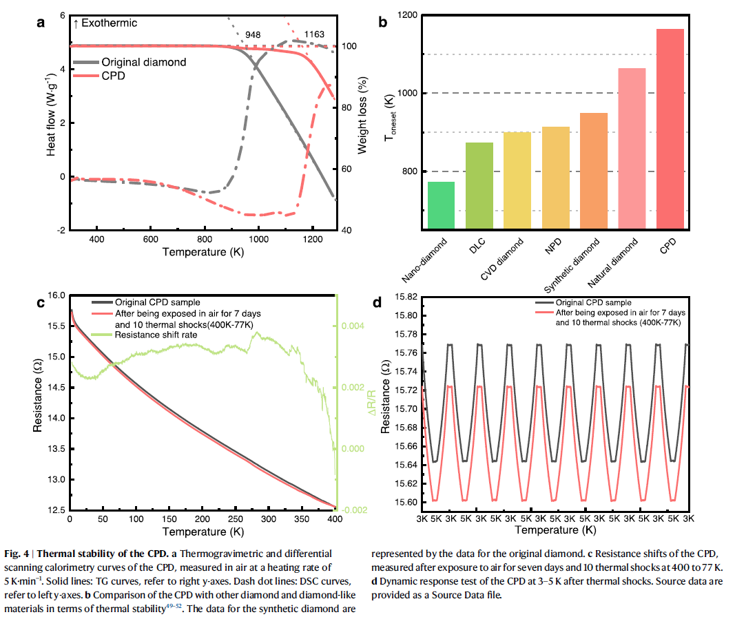 和其他传感器一样,低温温度传感器同样需要在室温或高温条件下进行操作或存储。而大温差测量或快速升降温对低温温度传感器都会产生损害,并导致电阻发生变化。这些问题的存在对传感器的热稳定性提出了更高的要求。研究团队首先对CPD的热稳定性(图4a)以及热循环后的电阻的变化情况(图4c、4d)进行了表征。金刚石在空气中的氧化通常包括两个过程:直接氧化和石墨化后氧化。由于石墨和其他sp2杂化碳材料通常比sp3杂化的金刚石更容易在空气中氧化,因此提高金刚石抗氧化性的策略通常集中在防止金刚石石墨化的研究上。有趣的是,在CPD中,引入sp2碳相后不仅没有降低金刚石的热稳定性反而使得CPD的起始氧化温度提高了超过200 K(图4a,原始金刚石和CPD的起始氧化温度分别为948 K和1163 K;图4b,CPD比其他金刚石材料具有更好的热稳定性)。研究人员认为这种异常特性与双相结构本身有关。在CPD中,sp3杂化的金刚石基相中均匀分布着纳米sp2碳相。这种微观结构避免了较大的连续的sp2碳键的存在,并且保护纳米sp2碳相免于直接和氧气接触,从而抑制了高温下sp2碳相的快速氧化。此外,sp2碳相的热膨胀系数大于金刚石,在加热过程中,CPD受到的内应力增加,进一步提高了金刚石的抗高温氧化性能。该工作是首次在不采用高压处理的情况下增强金刚石的抗高温氧化性。(图4a,CPD在5 K·min-1的加热速率下在空气中的热重(TG)曲线和差示扫描量热(DSC)曲线。图4b,CPD与其他金刚石和类金刚石材料的热稳定性比较。图4c,裸露在空气中七天后进行10次400至77 K的热冲击后,CPD的电阻变化情况。图4d,热冲击后CPD在3-5 K下进行循环动态响应测试。)