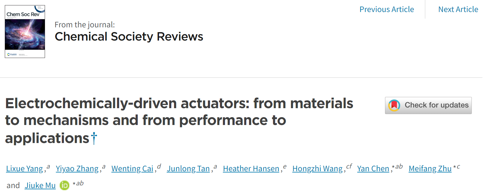近日,天津大学穆九柯教授团队联合陈焱教授团队、东华大学朱美芳院士团队以“Electrochemically-driven actuators: from materials to mechanisms and from performance to applications”为题在国际重要学术期刊Chemical Society Reviews (IF=46.2) 上发表长篇综述。论文基于材料类型和响应机制,全面总结了近年来电化学执行器的发展历程和创新突破,综合分析了不同材料-机制执行器间的性能特点、内在联系以及应用适配。文章第一作者为天津大学博士生杨利雪,共同通讯作者为天津大学穆九柯教授、陈焱教授和东华大学朱美芳院士,天津大学为第一通讯单位,其他合作者来自西安交通大学、上海电机学院和西弗吉尼亚大学。