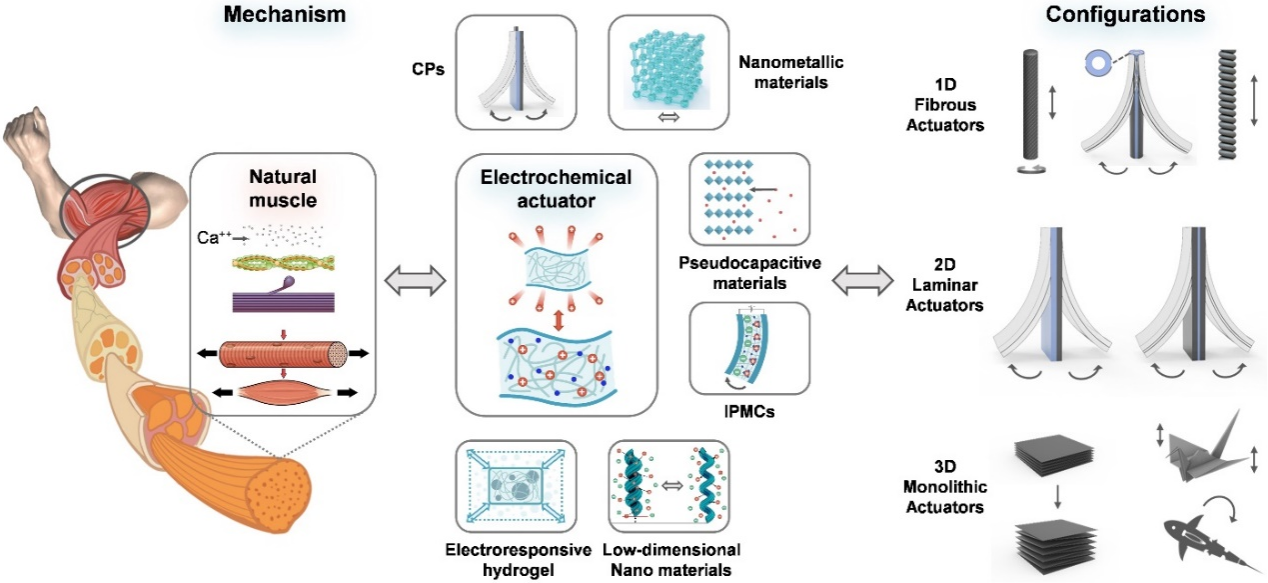 软体执行器是一种不借助马达等机械装置将光、电、声、磁等能量转化为机械动能的新型执行器件,是微型-软体化机器人设计的重要动力来源之一。在众多驱动机制中,电化学驱动机制(Electrochemically-driven)以其独特的离子吸附或嵌入方式引发材料或器件机械运动,具有运动精度优、能量转化率高以及仿生肌肉自锁(类似骨骼肌中的闭锁状态)等优势,使其在微型软体机器人和生物医疗器械中具有突出的应用潜力。
