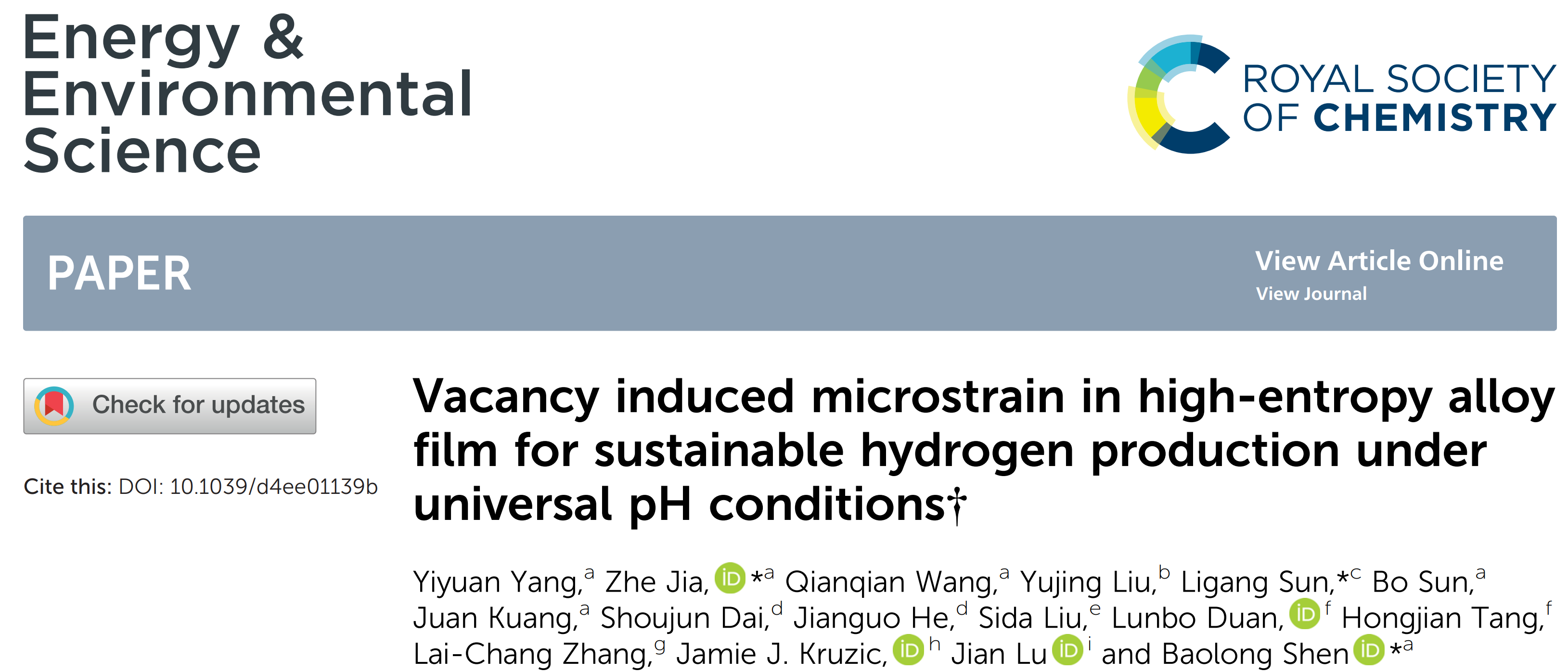 本团队采用“序构化”结构调控策略对多类型无序合金催化材料开展了系列研究,近一年研究成果相继发表在Adv. Mater., 2023, 35: 2303439(缺陷结构调控);Mater. Today, 2024, 72: 97-108(化学短程序结构调控)。在此基础上,为进一步拓展无序合金“序构化”调控策略,东南大学沈宝龙教授、贾喆教授与哈工大(深圳)孙李刚教授、伊迪斯科文大学张来昌教授、新南威尔士大学Jamie J. Kruzic教授、香港城市大学吕坚院士合作提出一种创新应变工程策略,通过空位诱导HEA薄膜产生晶格微观应变场,调控电荷分布与d带中心结构,实现优异全pH析氢反应(HER)催化活性。研究成果以题为“Vacancy induced microstrain in high-entropy alloy film for sustainable hydrogen production under universal pH conditions”发表在Energy & Environmental Science上,DOI:10.1039/d4ee01139b。