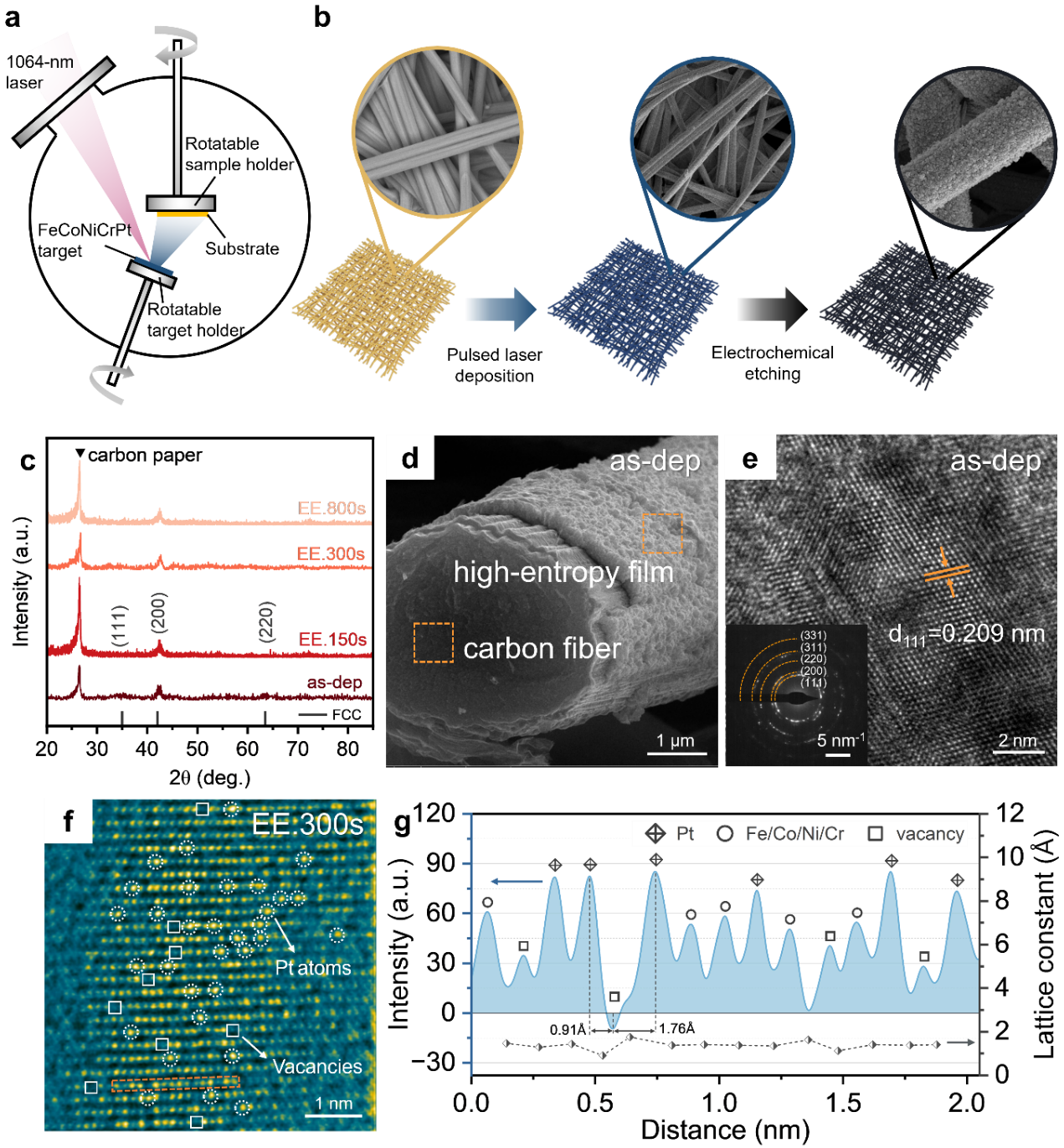 图1. FeCoNiCrPt HEA薄膜的制备与表征。(a)脉冲激光沉积和(b)电化学刻蚀过程示意图。(c)电化学刻蚀前后HEA薄膜的略入射X射线衍射图。as-dep HEA薄膜的(d)扫描电子显微镜图像和(e)高分辨透射电子显微镜图像,插图为选区电子衍射花样。(f)EE.300s HEA薄膜的高分辨透射电子显微镜图像,白色虚线圈所示为Pt原子,白色方框所示为空位。(g)图f橙色虚线框所示区域的像素强度分布图,曲线的峰和谷分别表示原子柱位置和间隙位置。