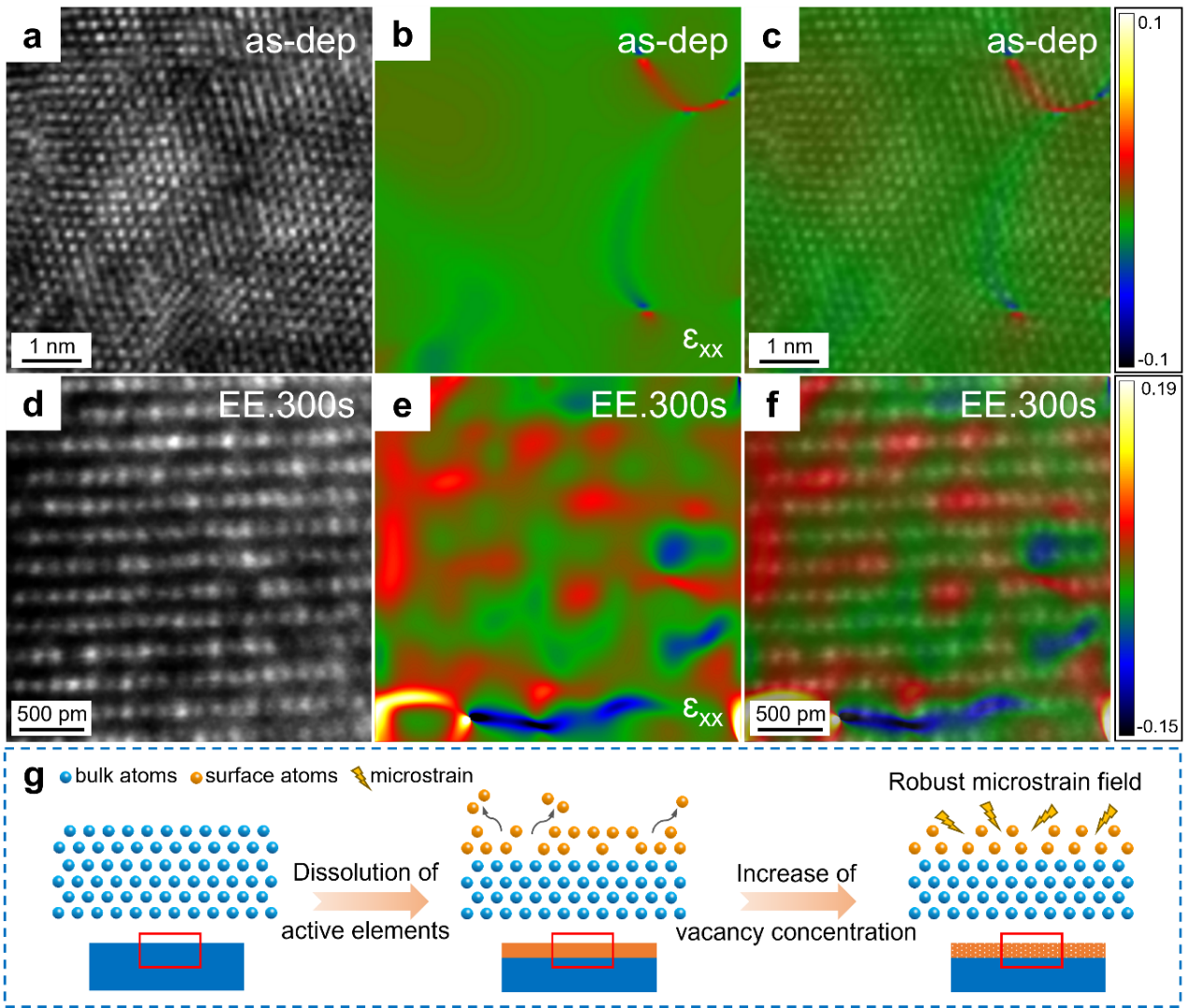 图2. FeCoNiCrPt HEA薄膜的微观应变表征。(a)as-dep HEA薄膜高分辨透射电子显微镜图像。(b, c)原始HEA薄膜的应变分析。(d)EE.300s HEA薄膜高分辨透射电子显微镜图像。(e, f)EE.300s HEA薄膜的应变分析。(g)电化学处理过程中HEA薄膜表面微观应变场形成机理图。