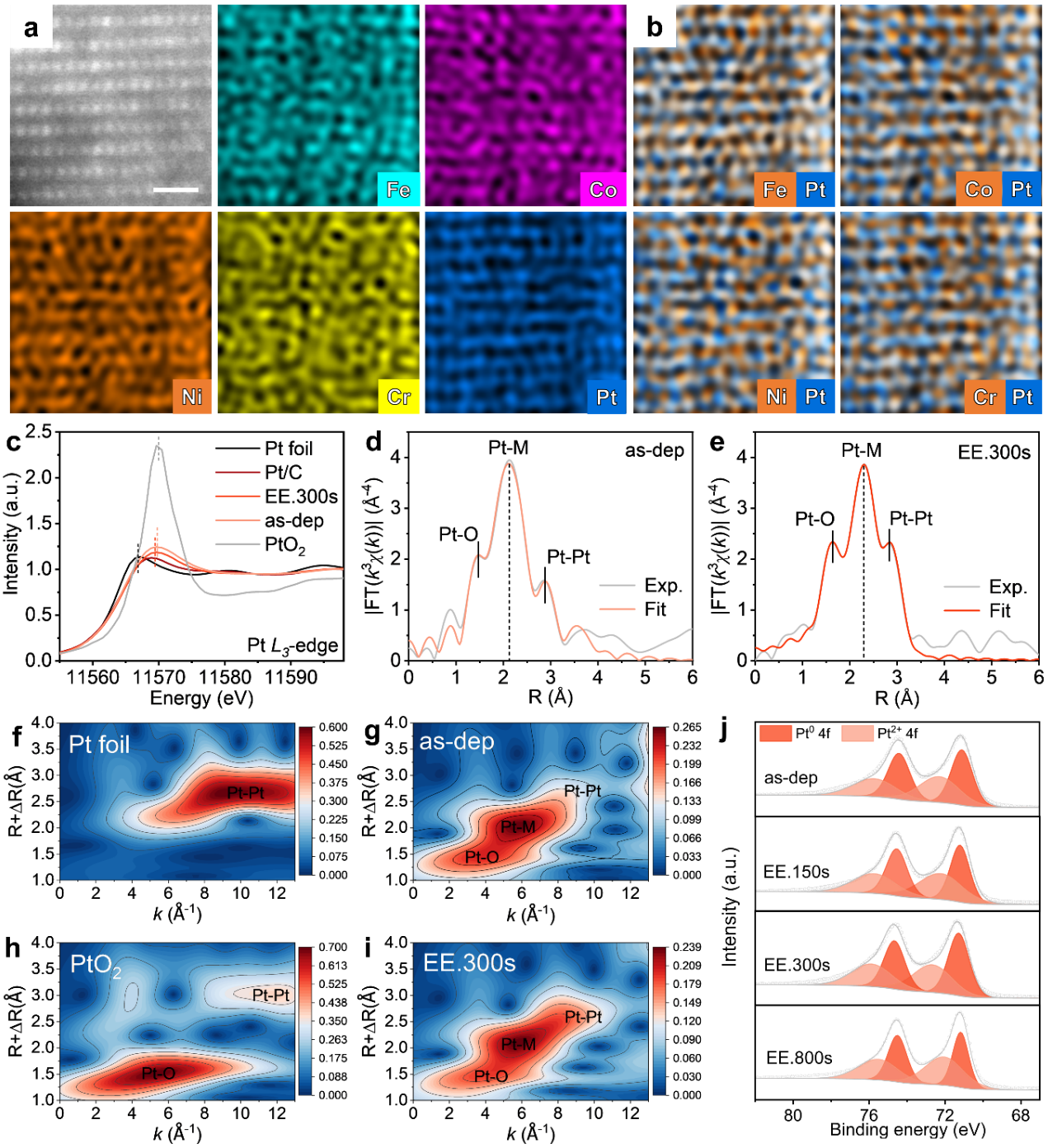 图3. FeCoNiCrPt HEA薄膜的电子结构和原子构型分析。EE.300s薄膜的(a)高角环形暗场相和(b)原子分辨率元素分布图,比例尺为500 pm。(c)Pt箔、Pt/C、PtO2、as-dep和EE.300s薄膜的Pt L3边X射线吸收近边结构谱。(d)as-dep和(e)EE.300s HEA薄膜的Pt L3边的扩展X射线吸收精细结构傅里叶变换谱,显示了局域应变对Pt-M和Pt-Pt键长的影响。(f-i)Pt箔、as-dep、PtO2和EE.300s薄膜的Pt L3边的扩展X射线吸收精细结构谱小波变换。(j)as-dep, EE.150s, EE.300s和EE.800s薄膜的Pt 4f X射线光电子能谱。