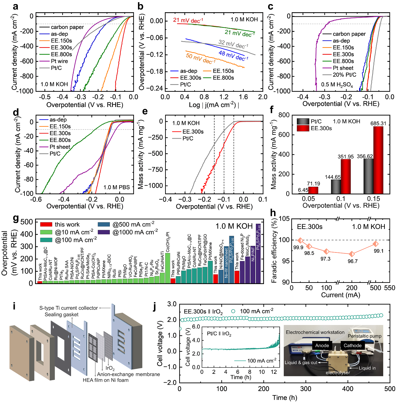 图4. FeCoNiCrPt HEA薄膜在酸性、碱性和中性溶液中的电催化性能。HEA薄膜在1.0 M KOH溶液中的(a)HER极化曲线和(b)Tafel斜率。HEA薄膜在(c)0.5 M H2SO4和(d)1.0 M PBS溶液中的HER极化曲线。(e, f)EE.300s薄膜和Pt/C在1.0 M KOH溶液中的质量活性。(g)EE.300s薄膜的碱性HER性能与近期报道的贵金属基电催化剂在不同电流密度下的比较。(h)不同电流下EE.300s薄膜的法拉第效率。(i)离子交换膜电解槽示意图。(j)EE.300s || IrO2离子交换膜电解槽稳定性测试,左插图为Pt/C || IrO2离子交换膜电解槽稳定性测试,右插图为电解槽测试实物照片。