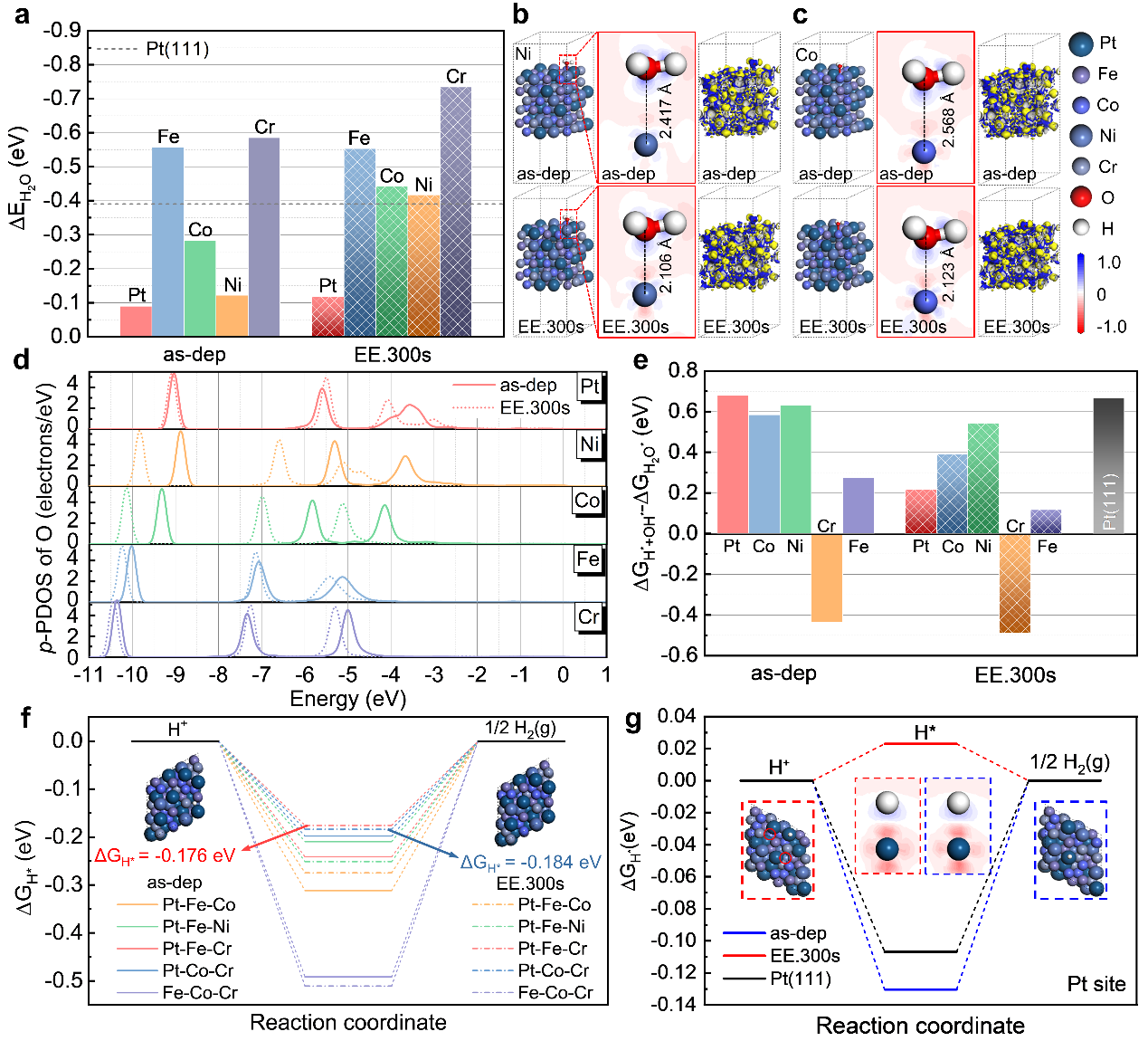 图5. 密度泛函理论模拟结果。(a)as-dep和EE.300s模型的Pt、Fe、Co、Ni、Cr位点上的水分子吸附能,灰色虚线为水分子在Pt (111)表面的吸附能。as-dep和EE.300s模型中(b)Ni和(c)Co位点吸附水分子后的原子构型和电荷分布图,黄色和蓝色分别表示电子的消耗和积累。(d)as-dep和EE.300s模型中各位点吸附水分子中氧原子的p-PDOS图。(e)H2O*分解为H*和OH*对应的能量变化。as-dep和EE.300s模型中(f)三原子位点和(g)Pt位点的氢质子吉布斯自由能,f插图是EE.300s模型中H*吸附到Pt-Fe-Cr和Pt-Co-Cr位点后的原子构型,g插图是as-dep和EE.300s模型中H*吸附到Pt位点后的原子构型,空位用红圈标出。
