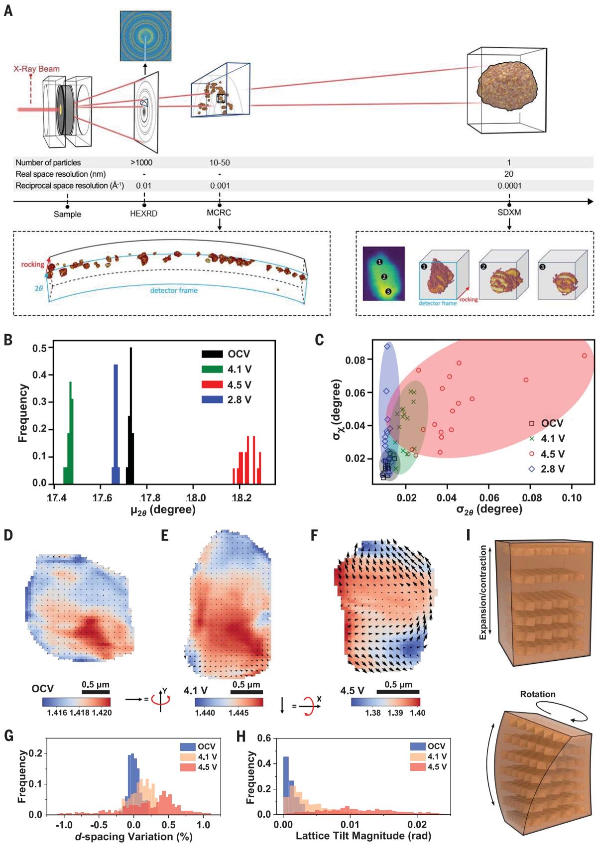 基于以上研究背景,美国阿贡国家实验室Khalil Amine教授、刘同超研究员、周涛研究员(通讯作者)等人利用多尺度空间分辨衍射和成像技术,观察到SC-NMC正极中存在不可逆的晶格旋转,并证明其在结构退化中产生了关键影响。这些发现为单晶正极性能失效和微观结构观测之间建立起了有效的机制联系,相关研究成果以“Unrecoverable lattice rotation governs structural degradation of single-crystalline cathodes”为题发表在最新Science期刊上。
