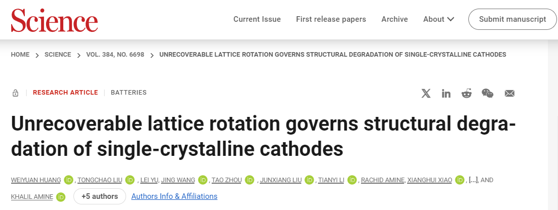 原文详情:Huang, et al. Unrecoverable lattice rotation governs structural degradation of single-crystalline cathodes, Science (2024). https://www.science.org/doi/10.1126/science.ado1675。