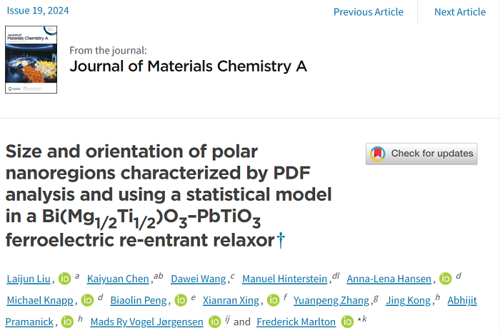 该工作提出的铁电弛豫体极性纳米微区尺寸的两种表征方法,为电介质储能、电卡、电光、电致应变等材料的开发提供了很好的参考,相关成果以“Size and orientation of polar nanoregions characterized by PDF analysis and using a statistical model in a Bi(Mg1/2Ti1/2)O3–PbTiO3 ferroelectric re-entrant relaxor”为题发表在Journal of Materials Chemistry A期刊上。论文第一作者为刘来君教授,历时五年,主要负责介电谱唯像统计模型的分析、PDF数据的分析、论文撰写;通讯作者是Frederick Marlton博士,主要负责反蒙特卡洛计算。