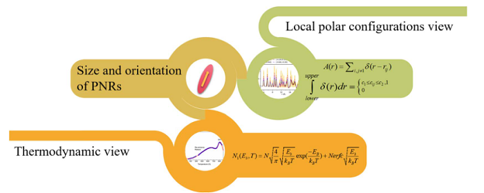 极性纳米微区在弛豫铁电体的重要特征之一,不仅对其铁电、压电响应产生重要的影响,与介电响应也有直接的关系。弛豫铁电体在Tm附近的介电频率弥散是动态PNRs在电场微扰下的典型呈现,PNRs冻结以后这种介电频率弥散就会消失。长期以来,对PNRs的尺寸估算一直是方兴未艾,尤其是在电介质储能、电卡、电光、电致伸缩等领域,PNRs的尺寸、数量、电场作用下的响应行为与物理性能直接相关。对PNRs尺寸的表征通常采用TEM观察,尤其是球差电镜,能清晰看到一个小区域里面原子的局域位移;另外采用中子衍射、散射等技术也能对PNRs尺寸进行定量表征。由于PNRs尺寸极小,采用电镜技术观察对实验人员的技能提出了很高的要求,不利于普及。本文提出了2种比较简单的分析方法:唯像统计模型和对分布函数方法,对PNRs尺寸和取向从热动力学和实空间进行了全面表征。