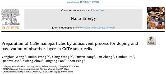 对CdTe吸收层的背表面p型掺杂和钝化是提升CdTe薄膜太阳电池的关键步骤。近年来,不同的Cu掺杂前驱体(Cu(I)和Cu(Ⅱ)材料)和钝化材料(含Se,Cl,Al材料)被研究。然而,鲜有研究者提出新的兼具掺杂和钝化功能的背面应用材料。鉴于此,2024年5月30日四川大学王瑞林教授(2021级博士生王永华为第一作者)于Nano Energy刊发兼具p型掺杂和Se钝化功能潜力的CuSe作为CdTe吸收层掺杂前驱体。采用与当前工业生产前端工艺相兼容的反溶剂沉积工艺,在CdTe吸收层背面均匀沉积了纳米CuSe颗粒。研究结果显示,CuSe处理的CdTe薄膜太阳电池最优器件开路电压达到842.5mV,远远高于CuCl2处理的CdTe器件(791.4mV)。J-V测试,Mott-Schottky测试和阻抗谱测试结果表面,CuSe处理的CdTe薄膜太阳电池器件不仅达到了p型掺杂的目的,同时获得了Se的钝化功能。兼具掺杂和钝化的前驱体材料选择策略,对高效率CdTe薄膜太阳电池的研究提供了新颖的研究思路。