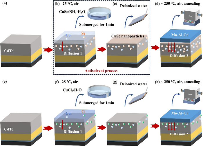 图2 CdTe太阳电池中的低温原位掺杂示意图。(a) CdCl2活化后的多晶CdTe薄膜。(b) 使用CuSe/NH3·H2O溶液沉积CuSe。(c) 反溶剂工艺制备CuSe纳米粒子示意图。(d) Mo-Al-Cr 电极沉积。(e-h) 使用CuCl2/H2O 溶液沉积CuCl2。所有步骤均在空气中进行。
