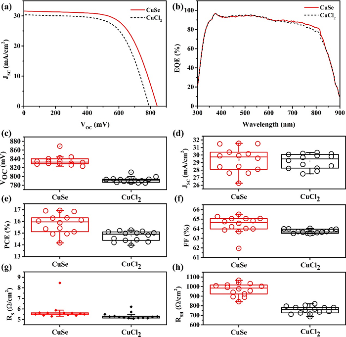 图3 器件性能比较:(a) 冠军器件的J-V 曲线。(b) 相应的EQE与波长的关系。(c-h) 光生伏特参数的统计分布。VOC (c)、JSC (d)、PCE (e)、FF (f)、RS (g)和RSH (h)。