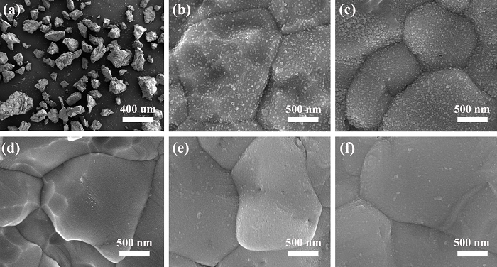 图5 CdTe/CuSe的微观结构。(a) CuSe 初始粉末。未进行反溶剂处理CdTe/CuSe:(b) 未退火,(c) 退火。(d) CdCl2 活化后的CdTe表面。进行了反溶剂处理的CdTe/CuSe:(e) 未退火,(f) 退火。