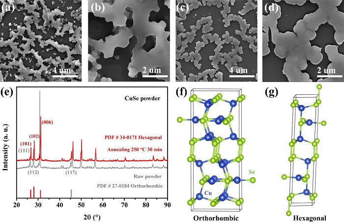 图6 退火前后沉积在玻璃上的 CuSe/NH3·H2O 溶液的扫描电镜对比:(a) (b) 不同尺度的未退火样品,(c) (d) 不同尺度的退火后样品。(e) 退火前后 CuSe 粉末的 XRD 对比。化学结构:(f) 正方晶态 CuSe,(g) 六角晶态 CuSe。
