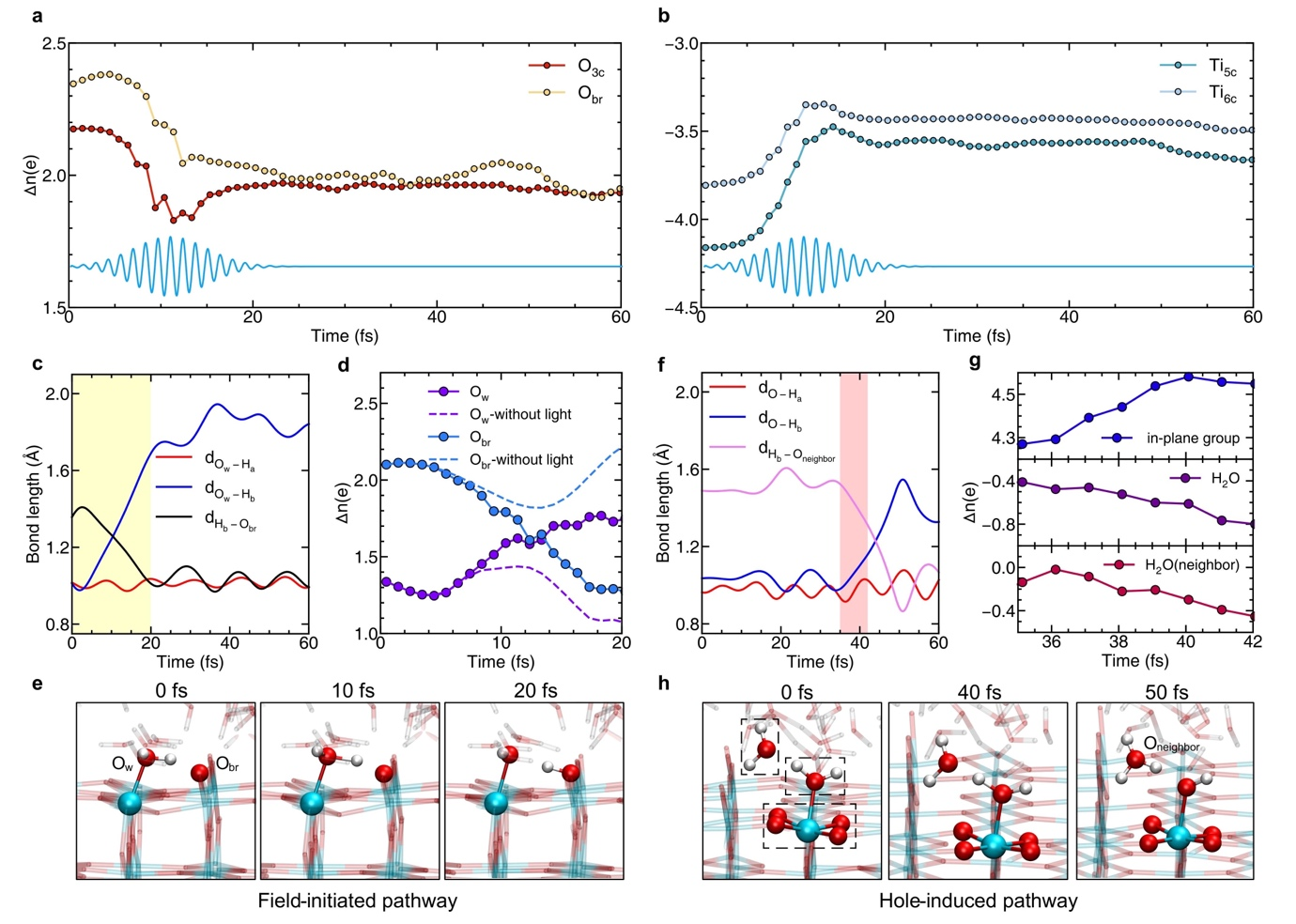 中国科学院物理研究所/北京凝聚态物理国家研究中心表面物理国家重点实验室SF10组博士生游佩桅、陈大强、刘新豹在张萃副研究员、孟胜研究员以及普林斯顿大学Annabella Selloni教授的指导下,利用基于实时时间依赖密度泛函理论的先进非绝热量子动力学模拟方法,在理解金红石二氧化钛上纠缠电子-核运动的关键作用和光驱动水分解过程的基本机制方面取得了重大进展。该研究工作揭示了水-金红石 TiO2(110)界面上由平面内表面极子畸变促进的光激发空穴传输驱动的水解离途径。观察到非绝热面内极子运动的两个阶段,即扩展和恢复,它们与钛 3d 轨道的占据变化密切相关,引发了空穴传输驱动的水分解。以前的计算研究估算了光诱导水分解过程中质子转移的能垒,但没有考虑这一过程中的非绝热性质。只有通过光激发非绝热动力学模拟,才能准确描述和确定激发态的这种强相关电子-核运动。同时,水与表面配位不足的氧原子的氢键结合也引发了场致电子重分布,进而导致水分子通过质子转移到表面氧而直接分解,这与空穴驱动的水分解途径不同。由上述两种不同机制(空穴驱动vs场致效应)引发的水分解过程之比约为 1.25,表明这两种分解过程对金红石表面水分解反应具有相似的贡献。