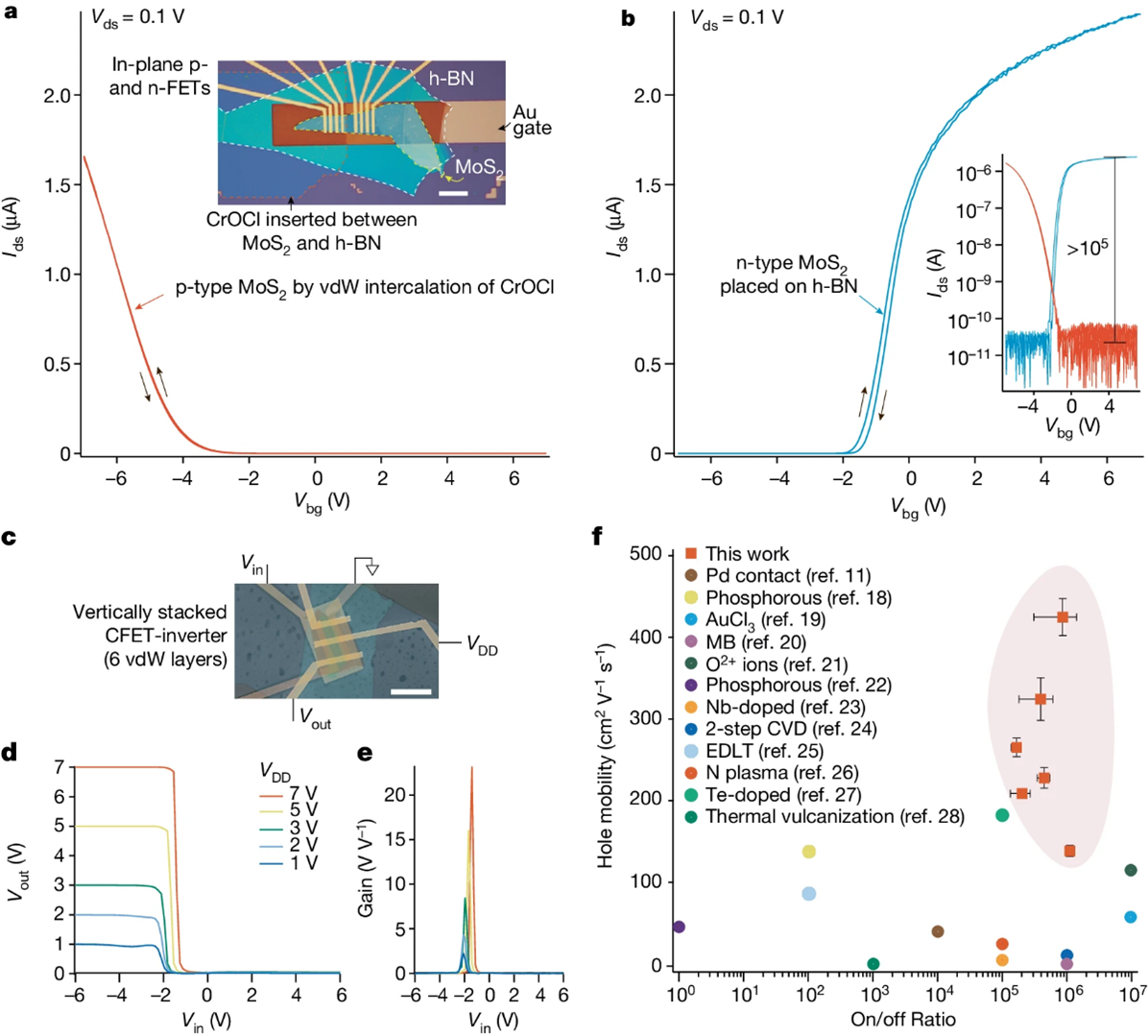图2 MoS2-CrOCl 互补场效应晶体管的电气性能;© Springer Nature Limited 2024