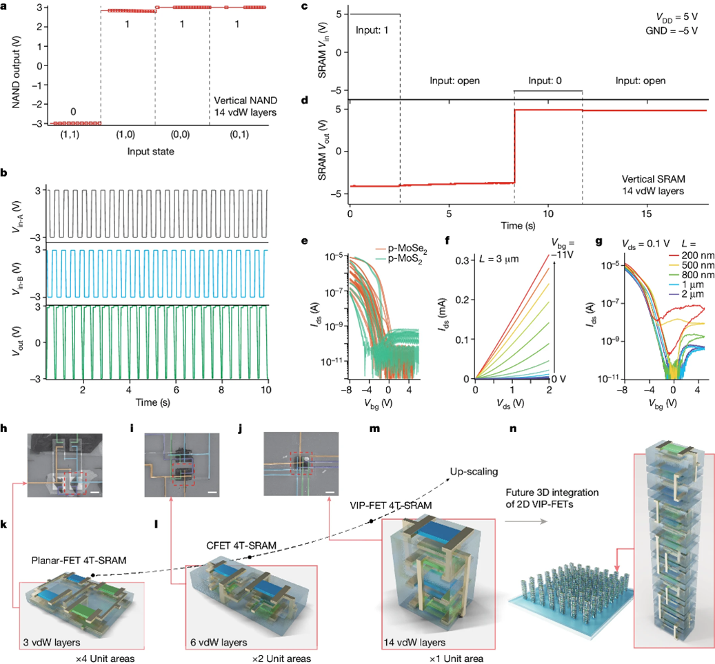 随后,研究人员构建了互补逻辑电路,并对这种自下而上扩展的架构进行了基准测试,证明研究的互补逻辑电路具有高达14 vdw堆叠层的真正3D架构。进一步,研究人员利用垂直堆叠的方式,制备了由14层范德华材料组成、包含4个晶体管的互补型逻辑门NAND以及SRAM等器件,证实了提出的vdW界面耦合诱导的p型掺杂可能是设计未来三维垂直扩展器件的有效策略。