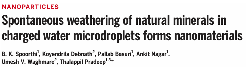 在垂直节理发育的红色砂岩地区的丹霞地貌,片岩地区常见的梳状地形和花岗岩区的石蛋地形等。这些在地球上存在这的不同风格的地貌,都是由于自然风化形成的。其形态与岩石性质、地层产状以及地质构造发育程度有很密切的关系。在自然环境中,矿物的风化是一个缓慢而持续的过程,对于土壤的形成和地球化学循环具有重要意义。这一过程通常需要经历长久的时间,随着近年来纳米技术的兴起,科学家们开始探索一种更快速的方式来促进矿物的风化,以期在更短的时间内形成纳米级别的矿物颗粒。这一探索不仅对理解自然界中风化过程的机制具有重要意义,也为纳米材料的合成提供新的途径。印度理工学院化学系Thalappil Pradeep团队,揭示了一种新颖的矿物风化机制:在带电的水微滴中,常见矿物如石英和红宝石能够在毫秒级时间内自发分解形成纳米粒子。相关研究成果以“Spontaneous weathering of natural minerals in charged water microdroplets forms nanomaterials”为题目发表在国际顶级期刊Science上。
