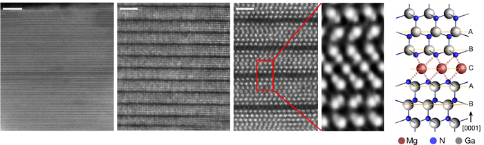 研究人员观察到由氮化镓和镁的原子层交替排列的超晶格结构。如图一所示,自左向右,通过依次放大的原子分辨级扫描透射电子显微图像,二维镁嵌入氮化镓式超晶格(MiGs)结构得以展示。iDPC-STEM图像(右二)清晰展现了该结构单元的全部原子,其示意图如图(右一)所示。