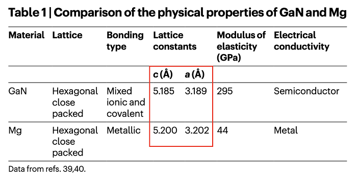 因为氮化镓和镁在物理特性上显著不同,自发形成超晶格的事实,在材料科学领域很罕见。然而,研究人员通过查阅氮化镓和镁的常温常压稳定相的晶格常数时发现(图二),虽然氮化镓是一种由离子健和共价键混合构成的陶瓷材料(电学性质呈现宽带隙半导体特性),镁是一种由金属键构成的金属材料(电学性质呈现金属特性),两种材料看似迥异,却有相同的六方密堆积晶胞结构,且晶胞常数差异可以忽略不计。氮化镓和镁的晶格结构“完美匹配”—这样罕见的巧合,可谓自然界的馈赠(”a true gift of nature”),大大降低了该超晶格自发形成所需的能量,在其自发形成中起到了关键作用。同样,基于相同原因(氮化镓和镁的完美晶格匹配),可以解释镁在氮化镓中易于形成共格析出相的倾向,从而解开了镁在氮化镓晶格中的溶解度低和易析出的特性之谜。