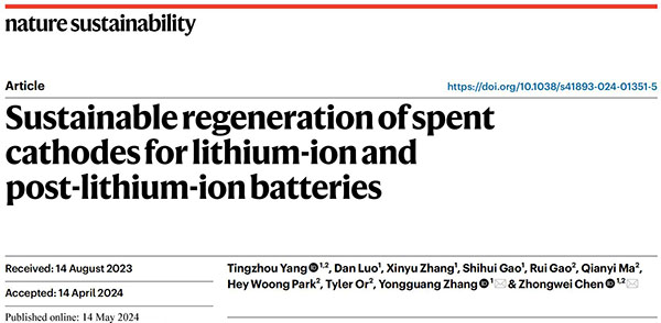 文献链接:“Sustainable regeneration of spent cathodes for lithium-ion and post-lithium-ion batteries”(Nature Sustainability,2024,10.1038/s41893-024-01351-5)