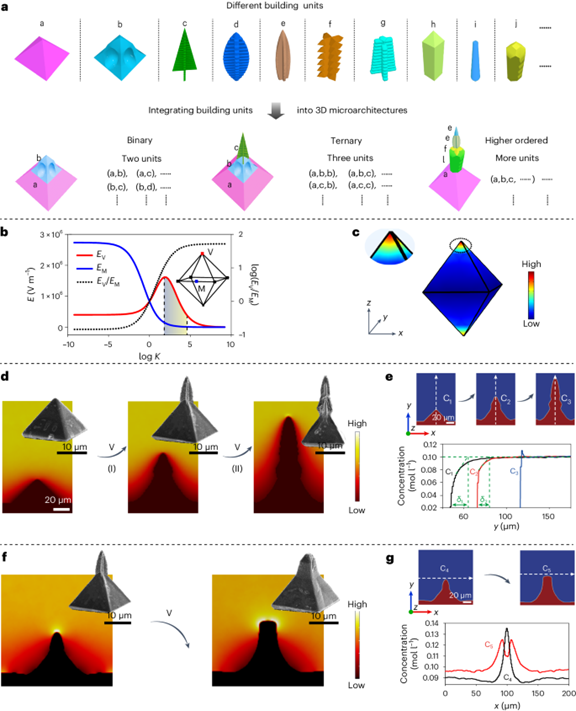 图1. 电沉积逐级构造复杂微结构示意图及COMSOL和相场模拟证明其可行性。