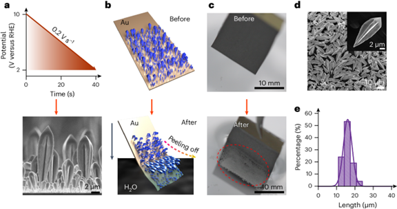 图4. 选择性剥离技术从电极表面剥离递减电压制备的结构均一微鱼雷结构。