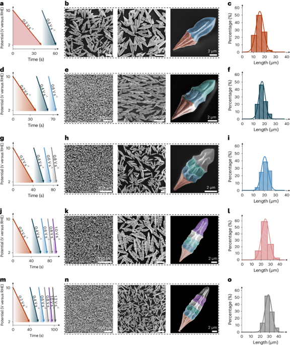 图5. 重复递减电压和选择性剥离技术制备多节微鱼雷。节数与递减电压重复次数决定,节在微鱼雷上的位置由递减电压斜率决定。