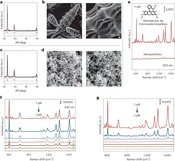 图7. 利用NaBH4还原Ag7O8NO3微结构,获得具有洁净SERS“热点”的银微颗粒,具有优异SERS传感性能。
